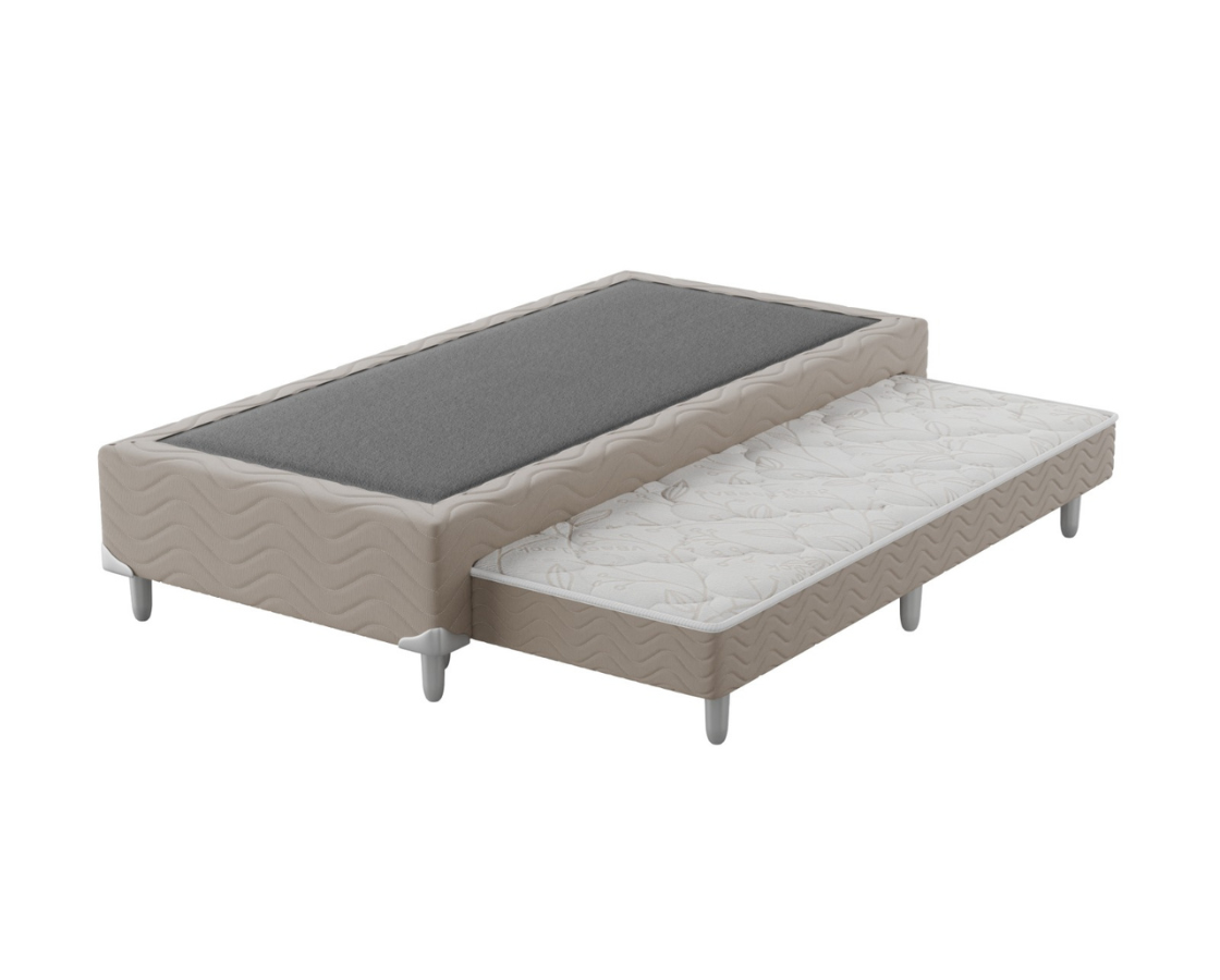 A Base Box Solteiro com Auxiliar Molas Ensacadas conta com uma estrutura em madeira, pronta para receber um colchão tamanho solteiro, e ainda possui a caminha auxiliar que já vem com molas ensacadas, para dar mais conforto a uma visita que vá ali dormir.